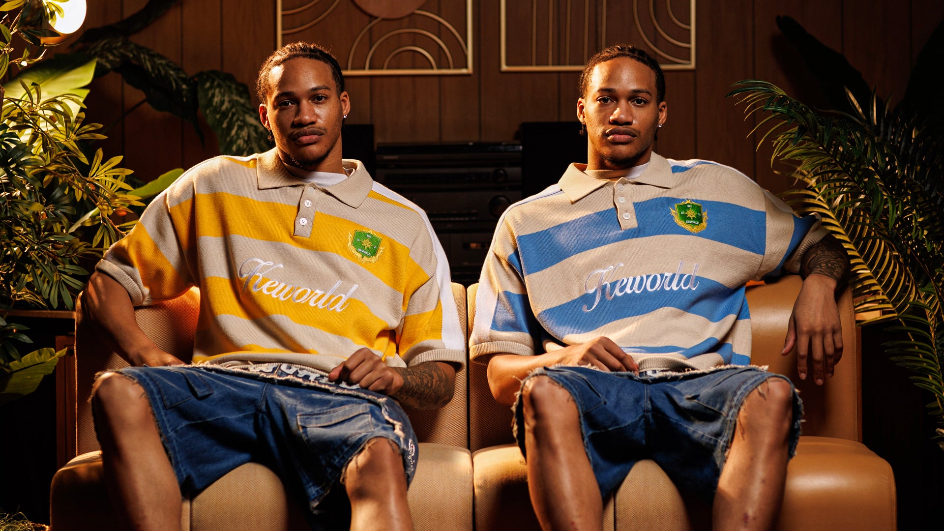 Vintage-inspired striped polo with bold cream and blue colorways. Made from a mid-weight cotton/knit blend for comfort and durability. Features a signature drop shoulder, boxy fit with cropped length and rib-knit cuffs. Embroidered patchwork detailing includes crest logo, numbers, and lettering for an authentic retro look. Perfect for adding a nostalgic touch to any fit.